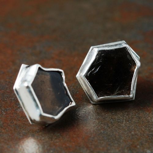 Handcrafted sterling silver bezel set asymmetric organic shaped Smokey Quartz slices studs.