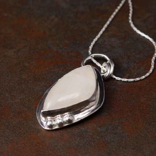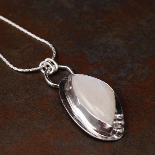 Handcrafted Pebble Rainbow Moonstone Sterling Silver bezel set pendant.
