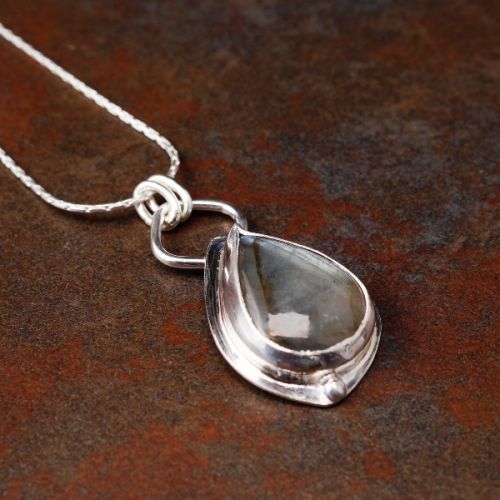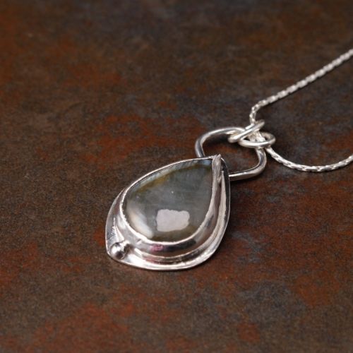 This contemporary stunning pendant was made using traditional metalsmithing techniques, to create a bezel setting of fine sterling silver, which is soldered to a sterling silver back plate and a 20 x 20 mm grey flash labradorite cabochon is set