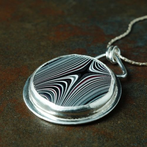 Stunning sterling silver pendant created using traditional metalsmithing techniques before soldering & round Fordite cabochon is set.