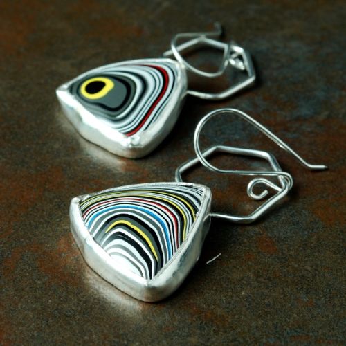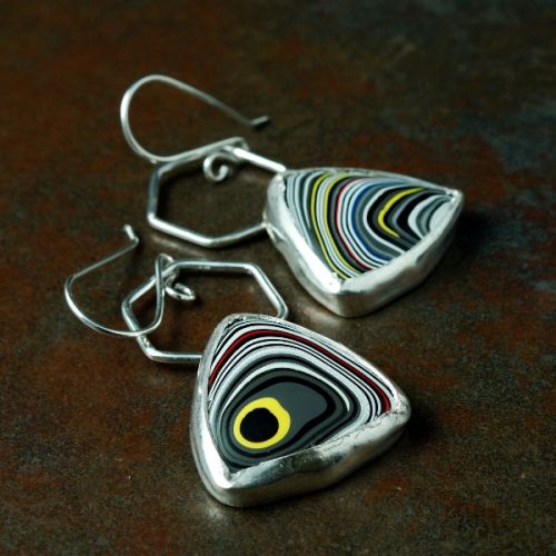 Handcrafted contemporary sterling silver bezel set trillion Fordite earrings