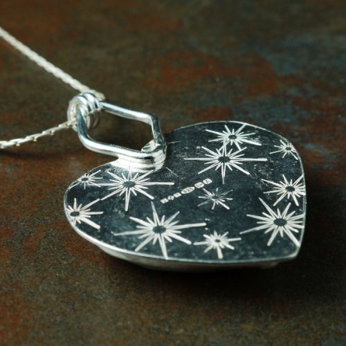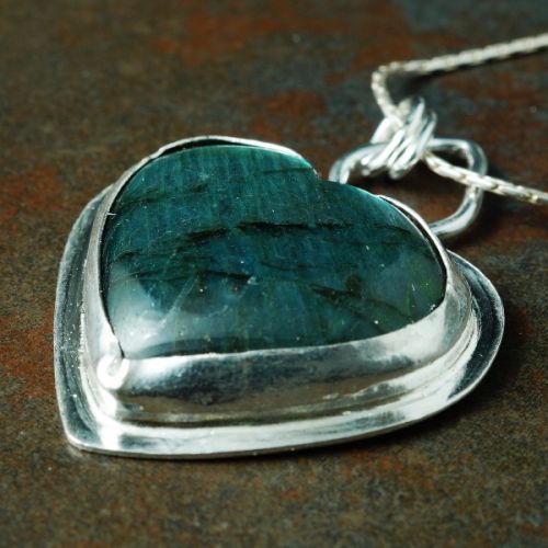 This contemporary stunning pendant was made using traditional metalsmithing techniques, to create a bezel setting of fine sterling silver, which is soldered to a sterling silver back plate and a 30x 30 mm green flash labradorite heart cabochon is set