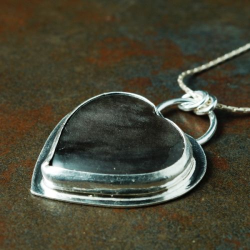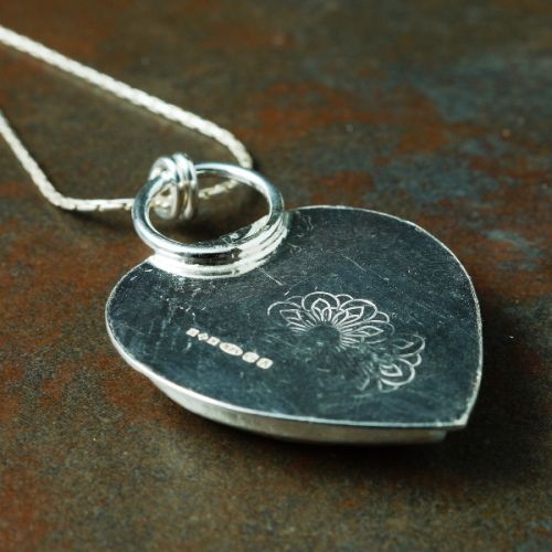 This contemporary stunning pendant was made using traditional metalsmithing techniques, to create a bezel setting of fine sterling silver, which is soldered to a mandela stamped sterling silver back plate and bail and a heart golden sheen obsidian cabochon is set.