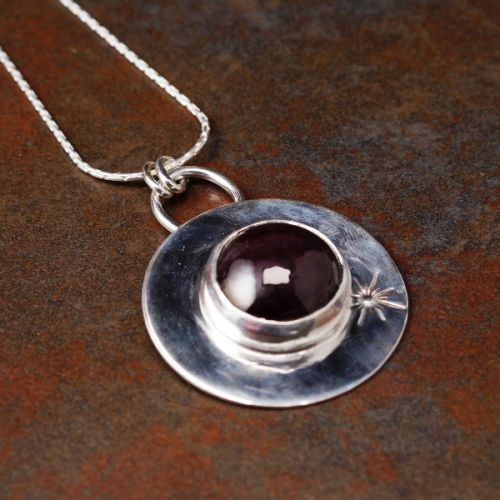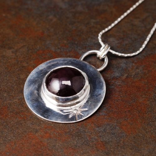 Stunning sterling silver pendant created using traditional metalsmithing techniques of a fine silver bezel setting which is soldered to a round sterling silver back plate and bail before the oval Star Garnet cabochon is added.